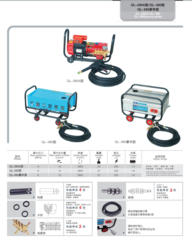 上海神龍集團(tuán)生產(chǎn)的高壓清洗機(jī)QL-280A型/QL-380型/QL-380豪華清洗機(jī),適用洗車場、汽修廠、建筑工地、外墻、防疫消毒、小區(qū)物業(yè)、工礦企業(yè)等。